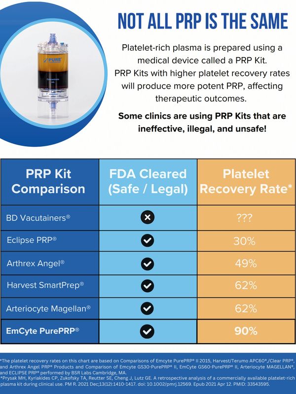 We use the EmCyte PurePRP system which is shown in independent third party trials comparing systems to have a higher recovery rate and produce a higher concentration of PRP which is important for the PRP to be therapeutic.